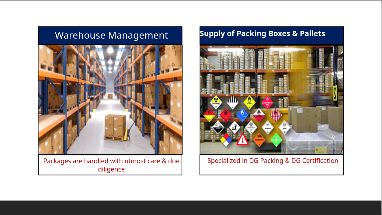 ANS : With the evolution of the international trade and delivery-based business models, warehousing has become extremely important. We can help you store your stuff in free trade warehouse and ease your cash flow by avoiding one-time clearance.